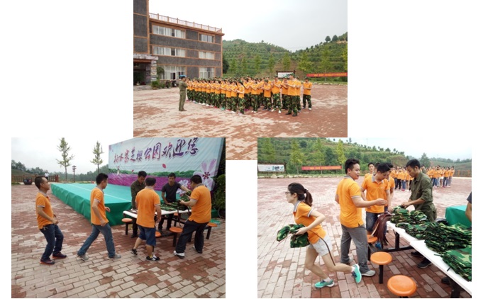 换衣大考验是我们接到的第一个任务,要求10分钟之内全体人员换好迷彩裤、佩戴好迷彩帽并集合,如果没有完成任务则需接受惩罚,我们紧张、我们奔跑、我们焦急,幸运的是我们完成了任务,为自己送上热烈的掌声!